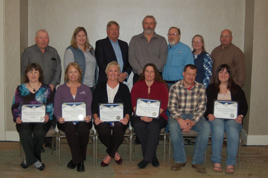 2023 National Mastitis Council Platinum National Dairy Quality Award Winners Front row: Kathy Bauer, RKB Dairy, Sandy Larson, Larson Acres, Ronda Fessenden, Fessenden Dairy, Karen Naatz, Naatz Dairy Cows, and Nathaniel and Amanda Canfield, Stuart Farms Inc. Back row: Randy Bauer, RKB Dairy, Brooke Trustem, Larson Acres, Tim Fessenden, Fessenden Dairy, Willie Naatz, Naatz Dairy Cows, Dan and Sandra Stuart, Stuart Farms Inc., and Jim Good, Michigan State University.